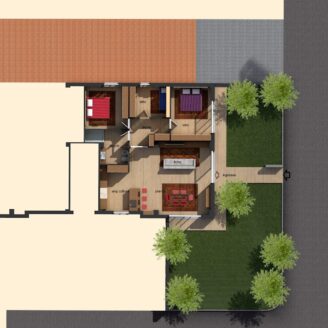 Possibilità di cambio destinazione d’uso con progetto di massima per appartamento con ingresso indipendente, composto da: ingresso su ampio living open space con angolo cottura, tre camere e bagno oltre a giardino privato.
